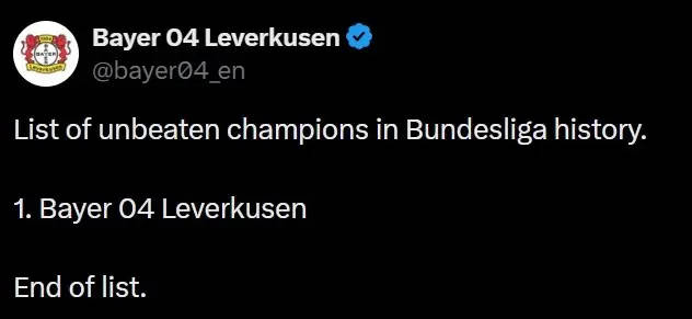 北京时间1月25日消息,2025-26赛季德甲第19轮,拜仁主场1-2遭奥格斯堡逆转,吞下本赛季的联赛首败。据德国媒体报道称,赛后,勒沃库森球迷开心庆祝拜仁输球,因为这意味着本赛季结束后,勒沃库森仍然是唯一一支以不败战绩夺得德甲冠军的球队。与此同时,勒沃库森官方社媒发文庆祝,“德甲历史上的不败冠军名单:1. 勒沃库森。名单结束。”2023-24赛季,在西班牙少帅阿隆索的带领下,勒沃库森以不败战绩夺得德甲冠军,并终结拜仁的连冠。
